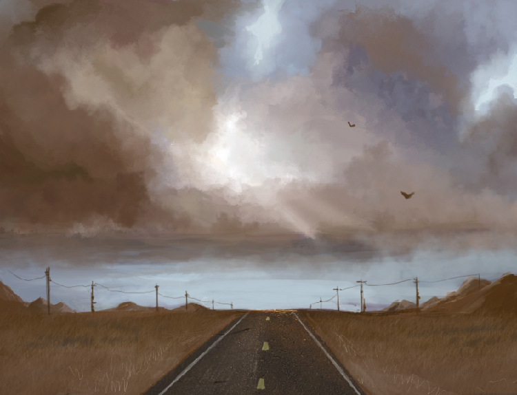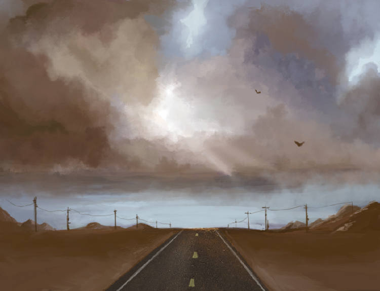 Now for the road texture, I created a dark brown texture on a new layer that would fit inside the road space, and then set it to the Filter/Texture/Grain. After I had the right texture I wanted, I then set it to Overlay over the pavement. I then painted two white lines down the road, ass well as the yellow follow lines in the middle. Using a brush on Overlay, I created some glare off the sun onto the road. Once you’re finished with that, merge all layers together.