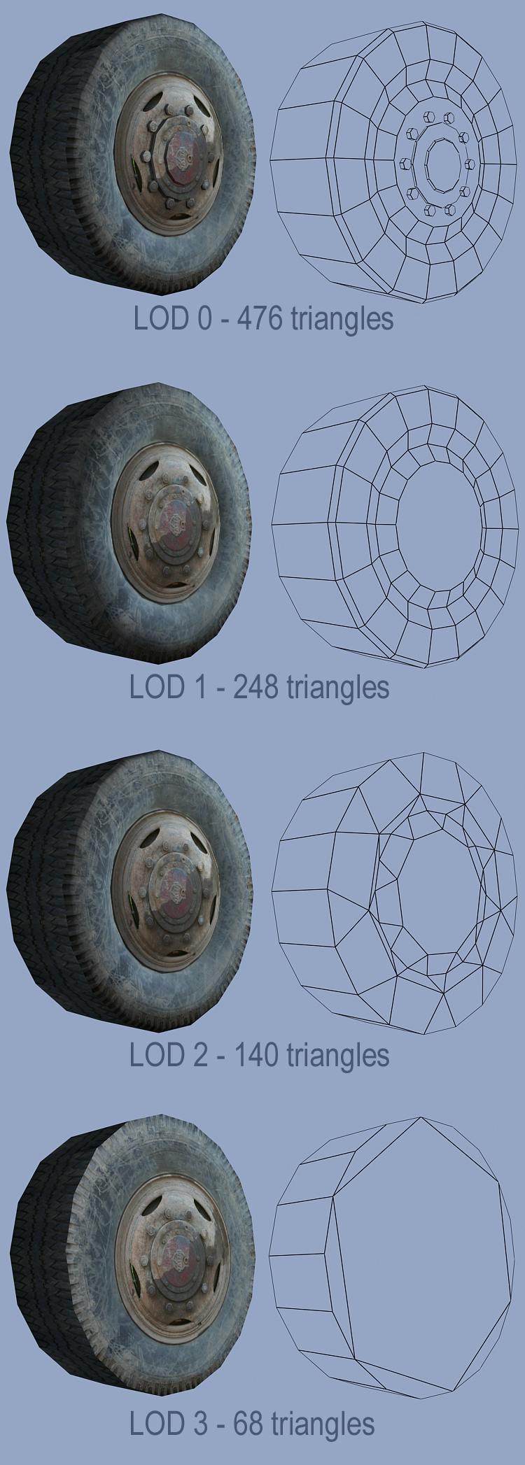 As You can notice from it, a key point in good LOD is to keep outline of the model same all the time and reduce polycount in other places. On LOD 1 You can see that the metal part outline have been kept on the model. If You really can’t find a big differences between LOD models when You don’t look too close, it means that it has been done properly.