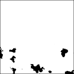 What I wanted to do in photoshop was to create the map that I will use to mix two textures together. The image needs to be grayscale … where there is white area in the image the first texture will be used, and where the black area is the second texture will be used. If it will be 50% gray, then the first and second texture will be mixed together. For this situation I didn’t used the gray tones, only black and white, but if you want to get more realistic results you can try to experiment with grays also. So, how can you create the mix image? Hardest way will be to paint it. But in some situations one trick works really nice, and that is to use photoshop cloud generator and threshold tool. But first thing that I’ve done was that I have created new layer. Then I’ve set the front color to white and back color to black, and used the Clouds generator in Render section of Filter menu. When I did this I have got something like in first image below. Now, I’ve used the threshold tool in Adjustments section of Image menu to get something like in second picture. At this stage I’ve made the layer with this cloud texture little transparent to see the boundaries of the UV map, and I’ve painted with white color on the texture to get something like the picture 3. 😉