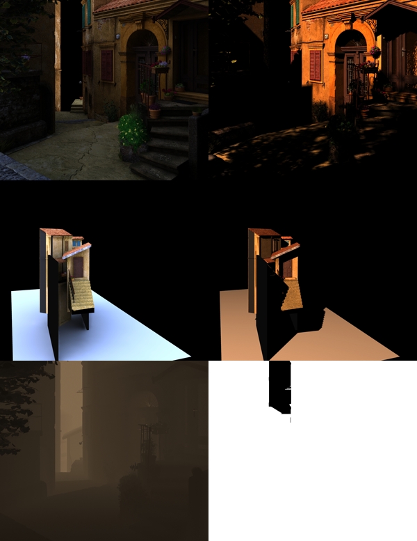 Lighting was very simple. As sunlight I used finalRender RecLight. The color was light orange, because I want to achieve warm sunset mood. Then I adjusted size of light, it caused little more blurred shadow. I also used skylight with physical sky and GI. For nice shadow from tree I used plane with opacity map. That’s all about lighting, simple as I said. More interesting part was rendering, I used pretty same technique as Tim Jones on DVD series about Environment creation from Gnomon Workshop ( http://thegnomonworkshop.com/dvds/tjo01.html ). I rendered background houses and the rest alone. I’ll explain my passes. Main was keylight, there was skylight and GI turned off and RecLight has a bit bigger multiplier, about 2. All passes were saved in 32bits with alpha. This is important; when you save in 32bits you can later adjust intensities of light, colors etc in large scale without damaging image. Then I rendered only ambient, it was skylight and GI, last pass was fog, with this I created little mood and fog for background. I rendered whole image with all the lights together and it took about one and half hour in 1000×863. Hardware was Core2duo 6600 and 2GB RAM; I must thank my friend Loocas Duber who borrowed me his computer for that when he was at Siggraph. So it’s time to put all passes together.