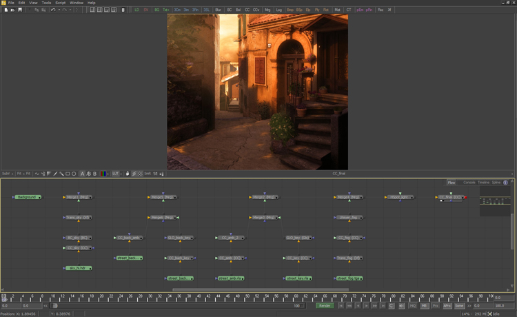 I want to try Eyeon Fusion for postproduction. I briefly wachted tutorial and try it. I’ll explain it shortly. If you want to learn Fusion better, you should download learning videos from eyeon’s website. I imported all passes to Fusion and also imported sky image. I applied Color Correct node on every footage and adjusted all parameters. Then I used Merge nodes to merge all image togehter. I also add Glow node to Keylight footage and finaly Hotspot node to simulate decent volumetric light. Above all nodes I applied final Color Correct and adjusted final look of image. You can see whole tree of nodes in picture below.