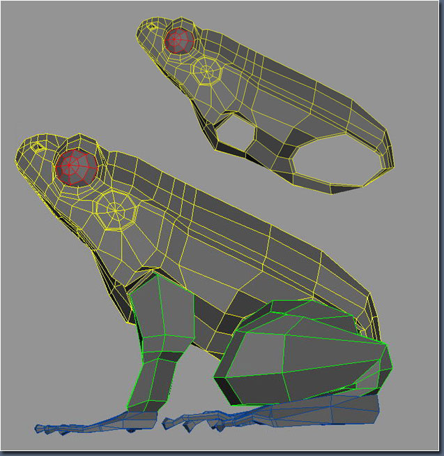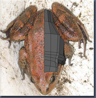 As you can see from the WIP pic below, I’ve built only half of the frog so that I had only half of the UV map to deal with.