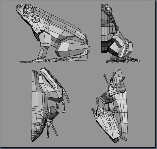 The first thing was to do some research to find some good references, having in mind the final result I wanted to achieve. I wasn’t able to find all the views of the same frog that I wanted, so I mixed a lot of different frogs in order to model the main shape.