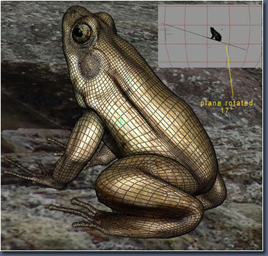 Now was the time for setting up the scene. I’ve created a simple plane where I placed the frog and I’ve rotated it about 17° (I’ve done that for the frog too). For the plane texture I’ve used a photo made by me, I’ve cropped it about 1300×900, I’ve than made the bump.