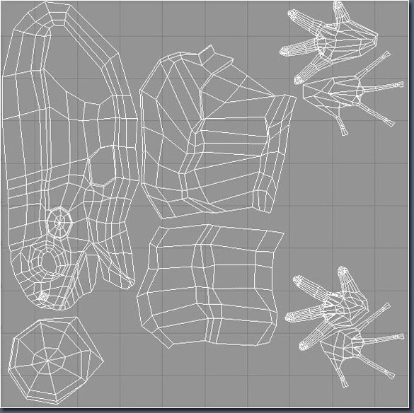 For the main (half) body and the leg, I’ve made 2 cylindrical maps, for the feet I’ve used 2 planar maps: 1 from the top view and one from bottom view. I’ve used a simple checker applied to a lambert shader for checking the overall process while tweaking the UV’s.