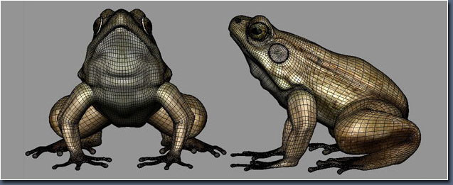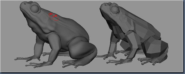 I’ve than duplicated the frog keeping the low model in another layer, and I’ve made the higher poly version (about 30.000 poly) doing a polysmooth. Finally I’ve added some details using the Maya sculpting tools trying always to follow the main reference.