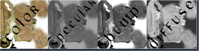 When the color texture was made I’ve created the specular, bump and diffuse map from that.