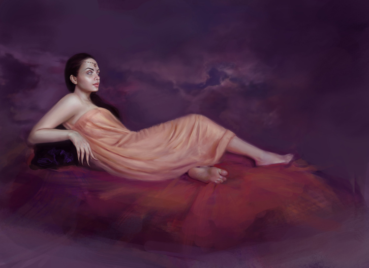 I continue refining her dress and also start painting in the bed that she’s lying on, deciding on the final colour for it that will be in harmony with the rest of the image. At this stage I also start trying to show the weight of her body against the bed and the folds that arise becasue of this.