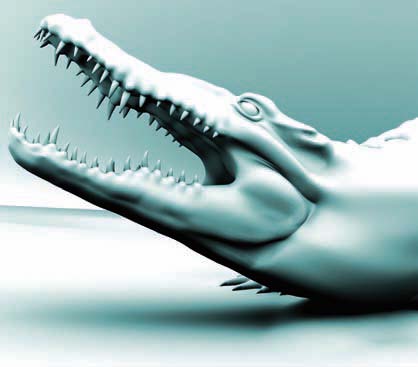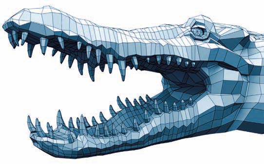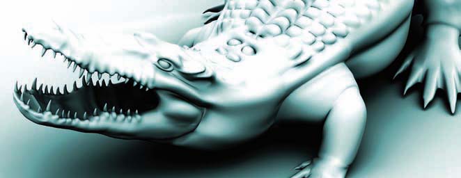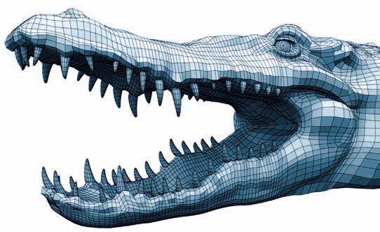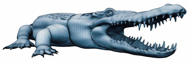This is my preferred kind of polygon modeling technique, and, switching between all the four views, I had the feeling of good control over the step-by-step process. Once happy, I went on to model the legs and the eyeball in the same way, and joined them to the main body geometry. I modeled only one tooth, then duplicated it and distorted it – pulling vertices – and, with the use of lattice deformer, created smaller and bigger teeth, according to the reference photos. I only made half of the alligator so that I had only half of the UV map to deal with.