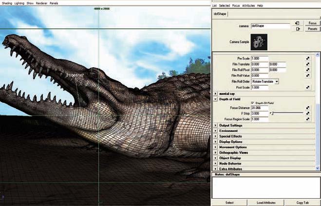 to the camera so that when I moved the camera, the dimensional value also changed. The last thing I had to do was put the value in the Focus Distance field and give the desired F Stop (Fig.10a and b). Before working on lighting, I tweaked the shader networks, tried different specular/reflectivity settings and played with the translucence value. I used an HRDI probe, made by myself, a directional light, and a point light with Ray Trace shadow enabled.