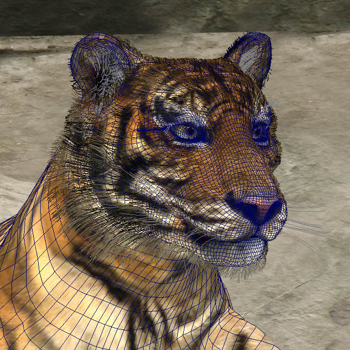 It was the first time I was using shave and haircut and I immediately noticed how powerful is this tool. I decided to put the fur only on the tiger’s head and in some side parts of the legs and paws because for the rest of the body I thought I could achieve a pretty good fur simulation with the only using of the textures. I created a total of six hair systems .Now I will focus on the main head fur, also considering that for the other hair systems I used the same procedure I am going to explain. I selected the head’s faces excluding the nose, inside of the mouth and eyes parts and I went to Shave —> Created New Hair. The first time I did that, I noticed that the hair normals was pointing inside of the mesh so I reversed the normals and created the hair system again. All was fine this time. Using the Brush tool I started scaling the hair according to the photos and when happy with the hair length I used “Recomb Hair”. This command made the hair comb nicely around the head. The only thing left to do was to use the Translate and the Puff tool to fine tuning the hair style.