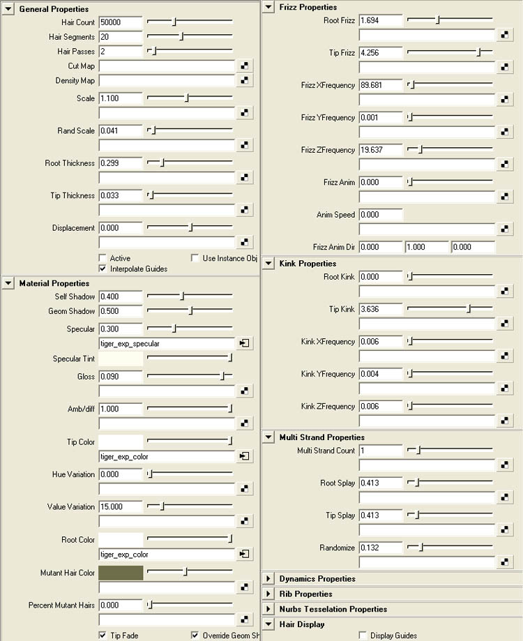 Than in the Material Properties of the Hair system I assigned the tiger’s color texture to the Tip and Root Colors and the specular to the specular field. In the screenshot you can see my settings for that hair system