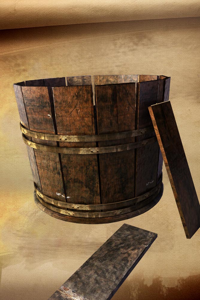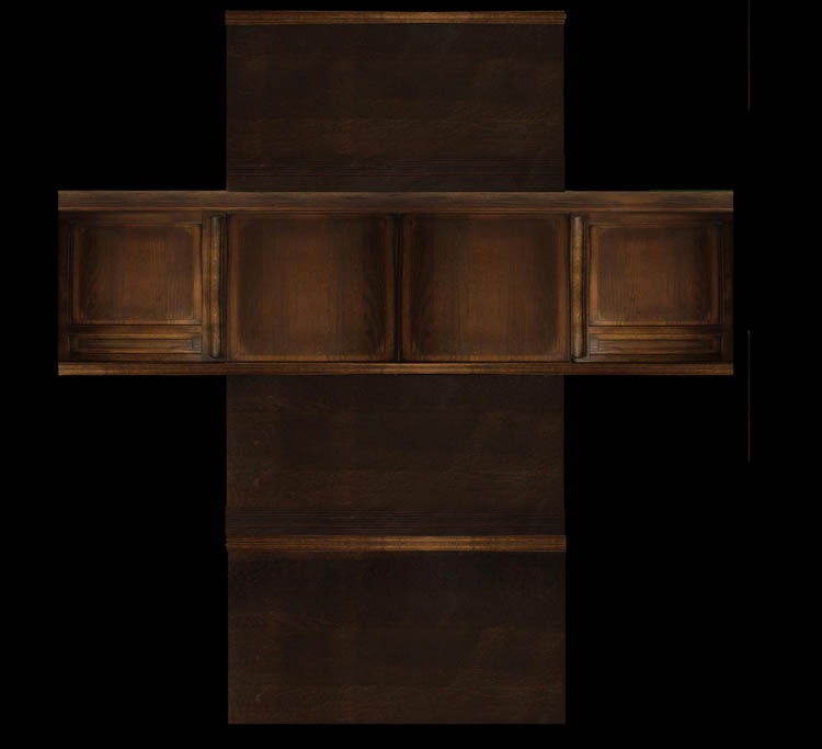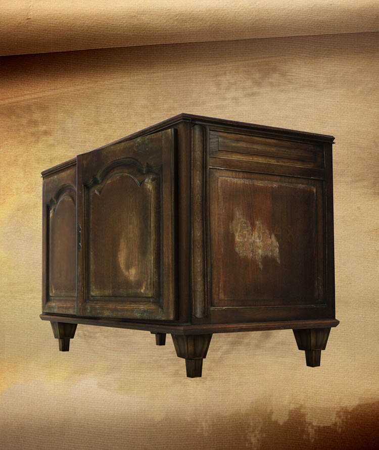I used some of the texture parts from the girders, or planks that I used for the wooden table. And the great thing about everything was that by using this cabinet another object from the personal library was added. It became a more personal project day by day. Unwrapping the cabinet was a pretty easy part because I just to make the t-form unwrapping that is often used when making a cube from a piece of paper. By having this t-form it was pretty easy to put the texture on and than I placed the corroded texture parts on the corners of the depth level from the 3d mesh. This is how I got the wooden cabinet to a good finished model.
