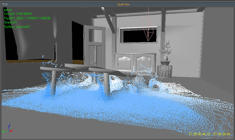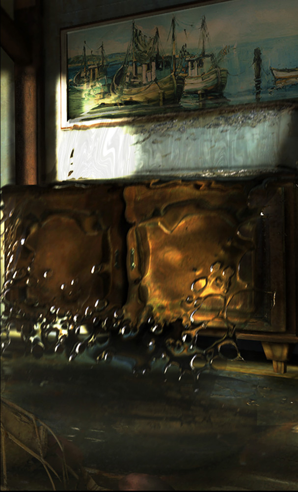 When I was shooting footage for my video making of, she was working right along side of me to look for good “ textures “ for the foam of water. She was almost drifting on the water with her camera in her hand to get the essence of water. From these photo’s I used some crucial parts to put in the 3 to 4 water simulation I made for the water flooding. That is how the water became as it is in the final picture.