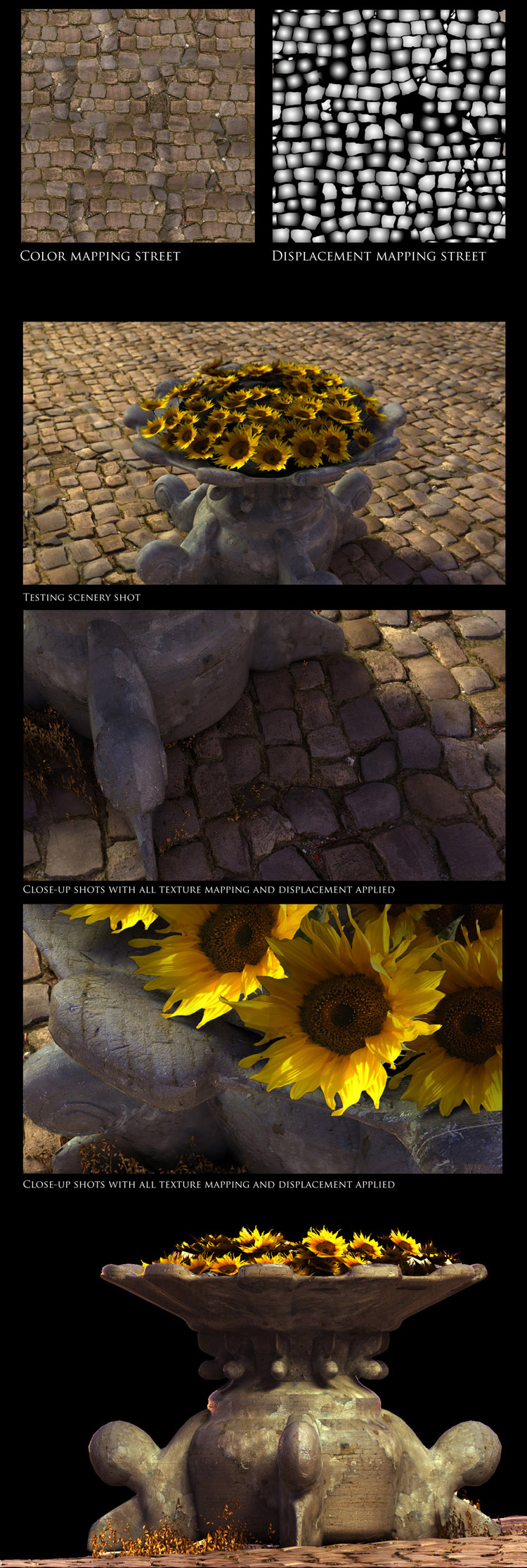 When i Made the fountain i felt that the floor that was laying under the fountain should be very real and tough. In Holland we call these stones “ Kinderkopjes ” which means childrens heads, cause the stones are rounded on the top, just as an human head. A Displacement map that i made in photoshop should create this realistic effect.