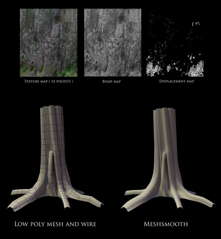 The trees are actualy created with simple cylinders and mesh modifiers. The Basic mesh are cylinders that are bend and welded together. Doing this as long as needed to get the right result.