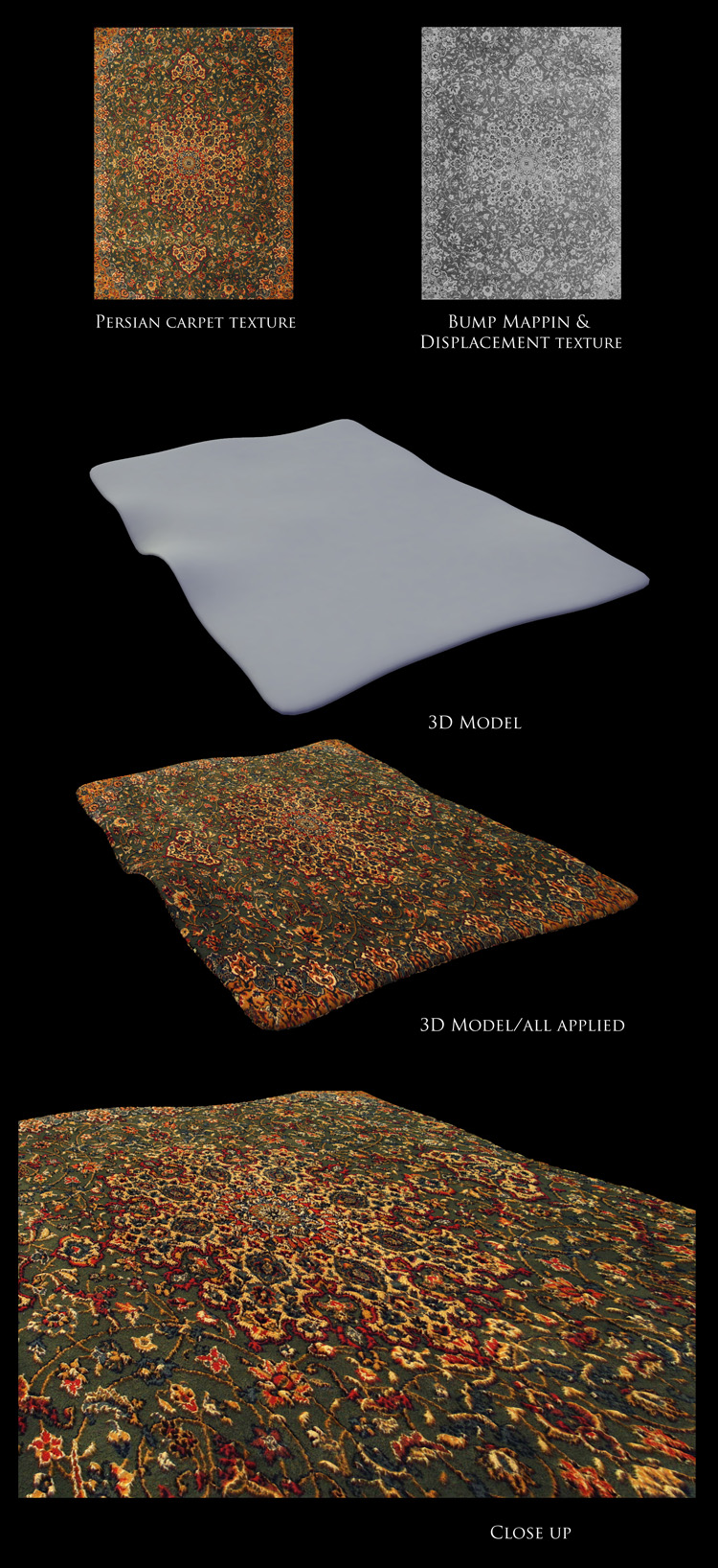 Next thing was to model the carpet where the chair was going to stand on. This texture i did not made myself, cause i didn’t found the right rug in this area. My Best friends wife is a persian woman , so i had already seen persian carpets and knew what i had to create. So this one i got from the internet and made my own displacement mapping for it. The result again was very strong.