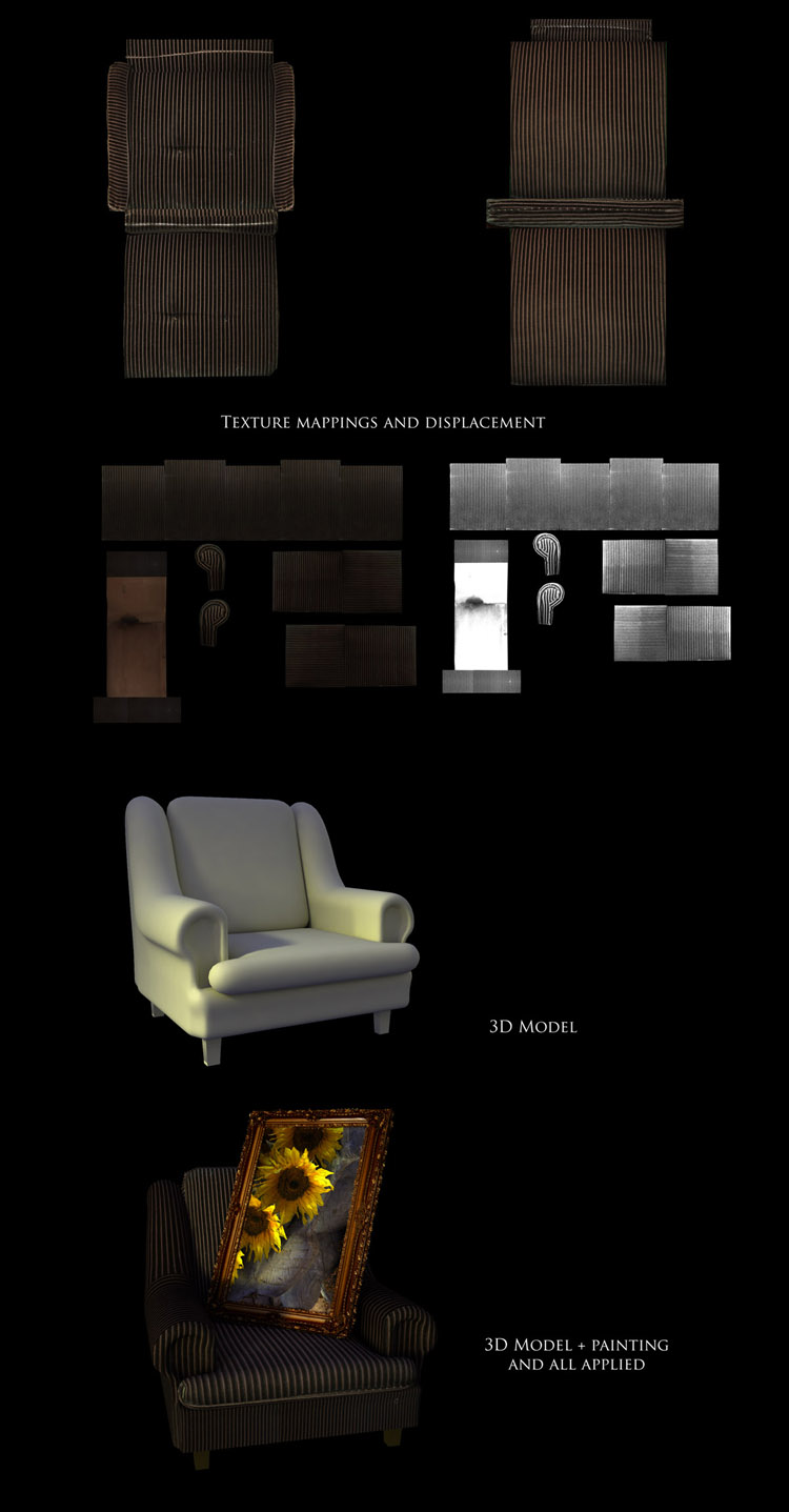 The chair you see on your left was actualy a couch. Its the couch that stands in my living room. I bought it for 25 euro 6 years ago. I love this couch and that is why i wanted to make a model of it. The Baroc kind of painting was made with displacement mapping applied to a simple 3D mesh. The picture on the painting is The Sunflower Fountain. The Center piece of this work of art.