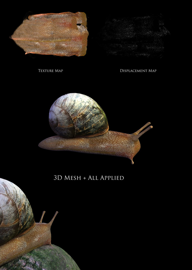 The Spiderwebs were pretty easy cause the alpha of an spiderweb is just white and a little bit grey. So you don’t have to paint out a lot of by yourself. If you copy the layer were the black and white contrast is the greatest you can use that as your alpha and there is your spiderweb. The creation of the snail was pretty hard. I already took a photoshoot of a snail a few months before i started the sunflower fountain, so i could pick textures of the macro photo’s i took and they where great for painting the snail. The displacement map was pretty hard, it was almost always too bumpy, a snail has a very soft bump mapping, bud in the end it was good enough for the scene to use it. I wanted to make the snail very realistic so i could make a angle of him so i could use him in his own individual scene.