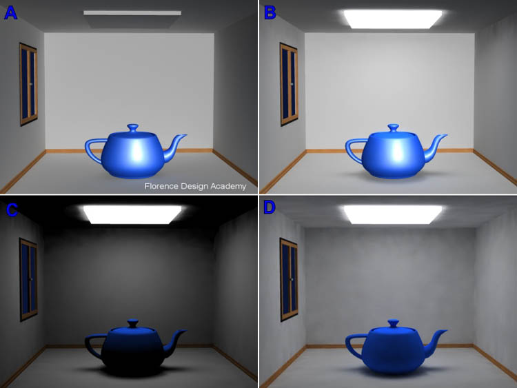 Image C: exactly the same scene of scene B, but now we have created and additional MR Omni and we have disabled it. Now finally we have a realistic result. It is clearly visible that the illumination is coming from the white on the ceiling.