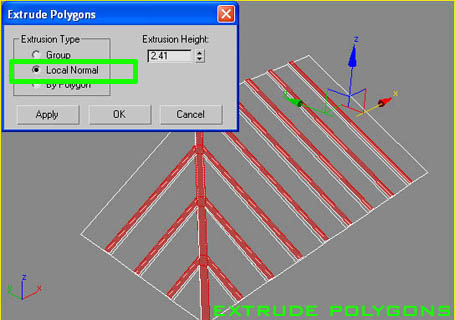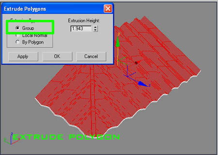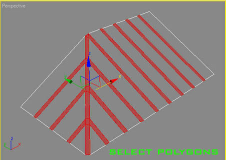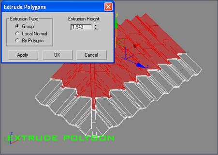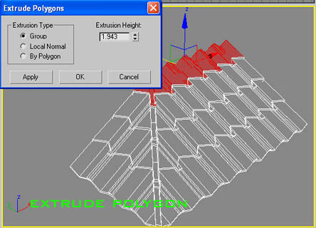 12. In the polygon sub-object mode, extrude theselected polygons. This is give the roof some thickness.