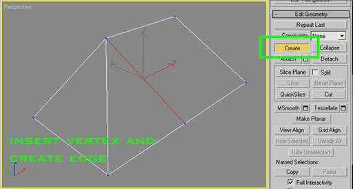 2. Now work in edge sub-object mode and insert a vertex to create one more edge as shown below. Note that the 2 vertices in the picture below must be at the same X-position.