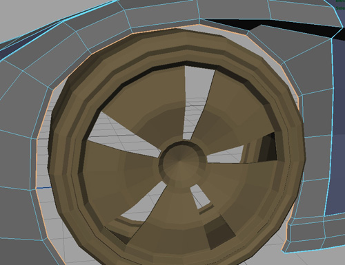 There is no interior modeled for the high-res wheel as this area will be barely visible on the final car and therefore will not require any special details on the normal map. This is often the case with high-res models that are going to be used only for baking maps as there are some areas that need not be modeled because they will not influence the final low-res model.Body details