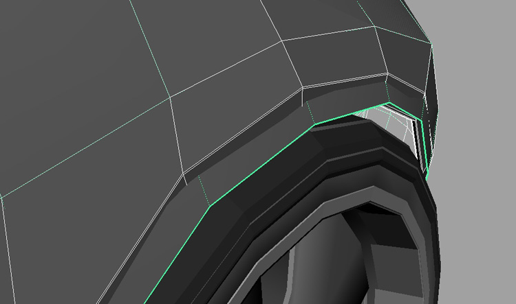 The borders of the low-res model are very important. They have to match the high-res geometry very closely so that baking the textures will not result in “blank spots” on the normal maps because of improper overlap. The white wireframe object in the next image is the high-res model without smooth. The green wireframe object is the low-res. As you can see, the two shapes might not be identical, but the borders are very close to each other.