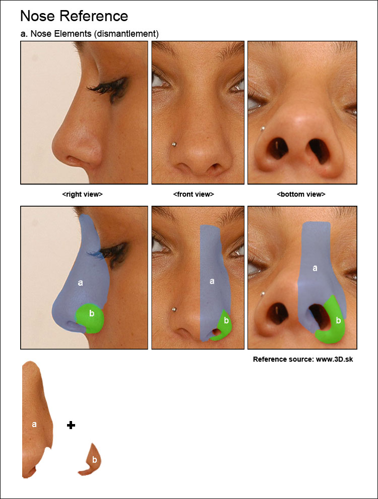 Ok, I am not going to use these photos as an viewport background this time as we need just the general shape. Notice the 2 main parts of the nose, lets call it “a” and “b”. Its also a good idea to keep your reference near so you can always check it out during modeling process.