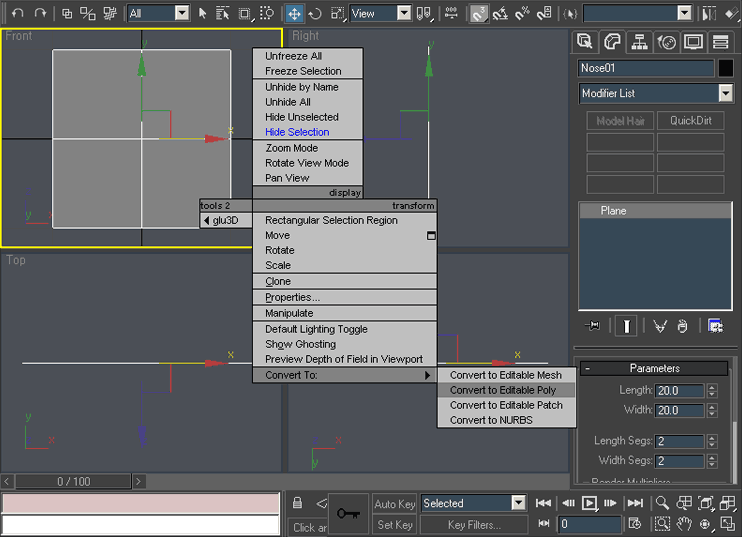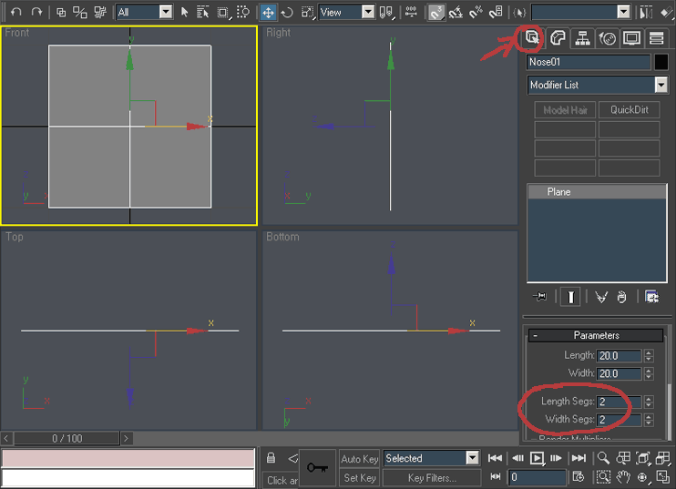 OK :), open your 3D studio max. First of all setup the viewport as on the picture above. To change the viewport right-click it’s name (for example Front) and choose Views/……. (in this case Right). When finished create basic plane object in the front viewport (Use right top “create” tab) with 2 Width and 2 Length segments. To move between viewports just right click in to the viewport you are going to work in.