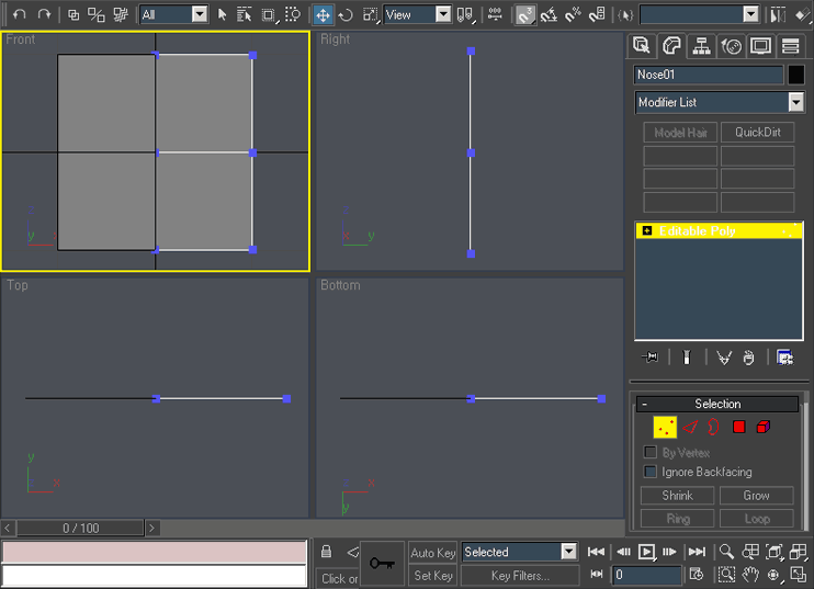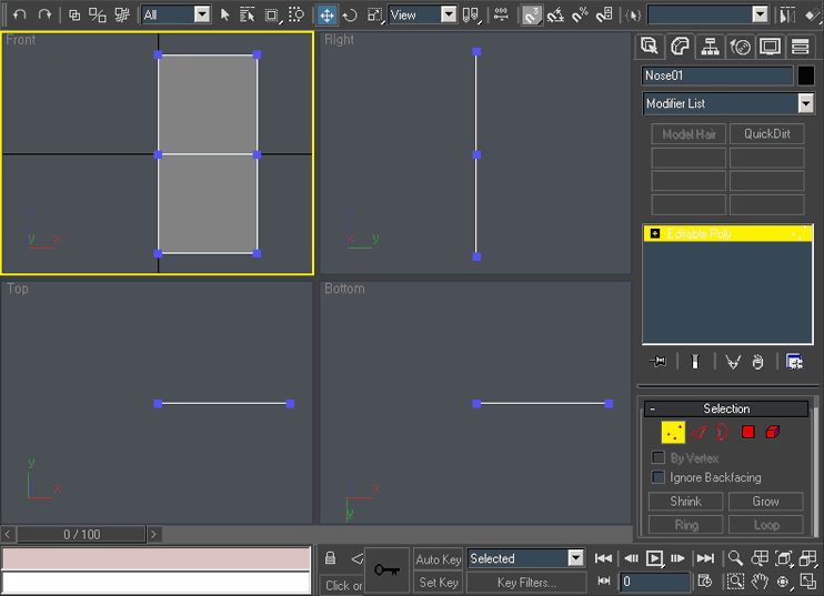 Select the right Edges in front viewport. (use “2” keybord key to activate edge selection. Similarly “1” for vertices, “3” for border, “4” for polygons, “5” for elements and “6” for top level selection. Practice it so you become familiar with it.)