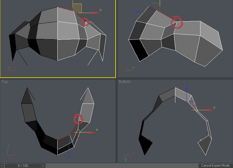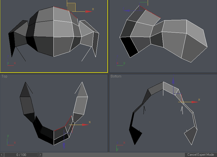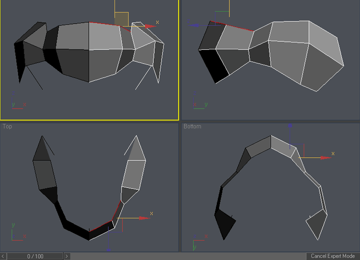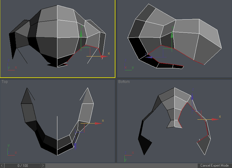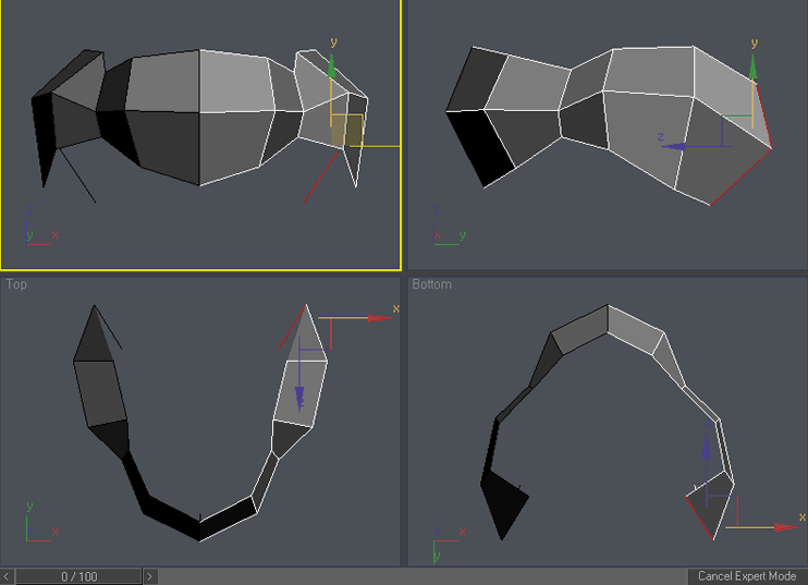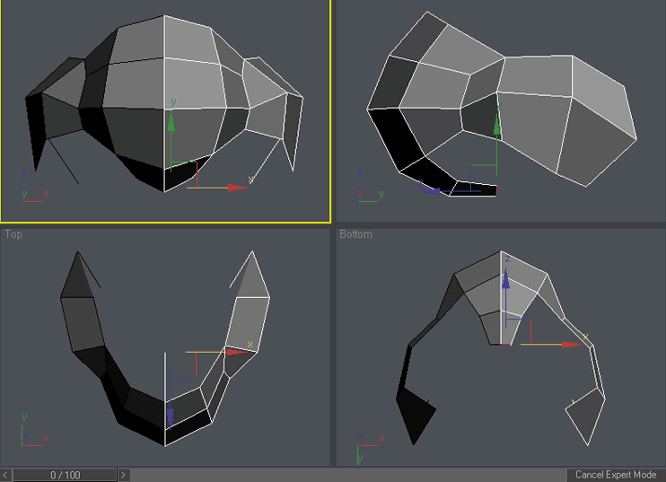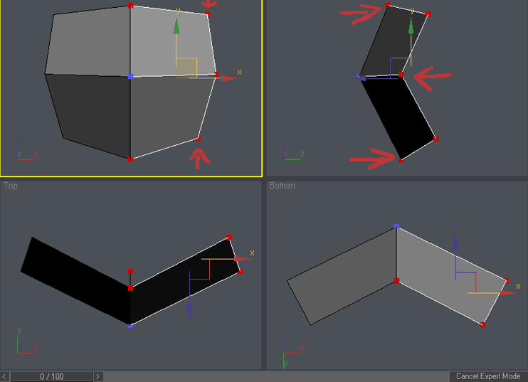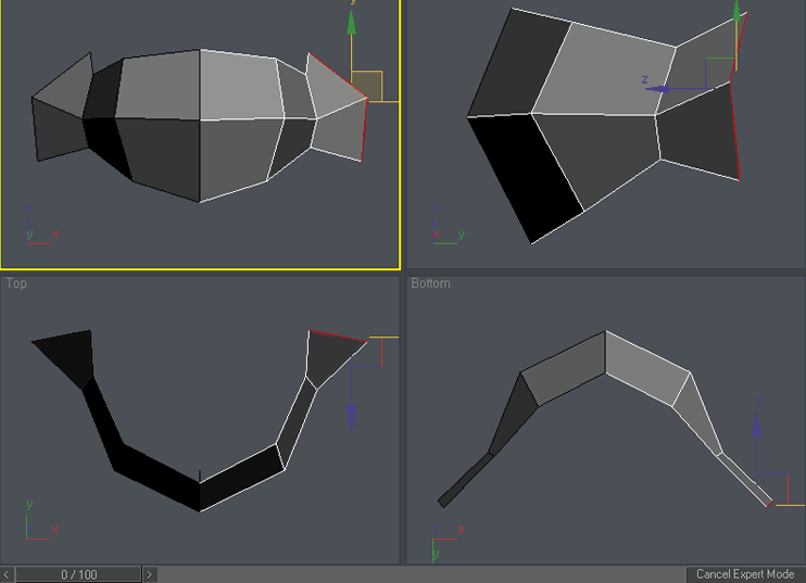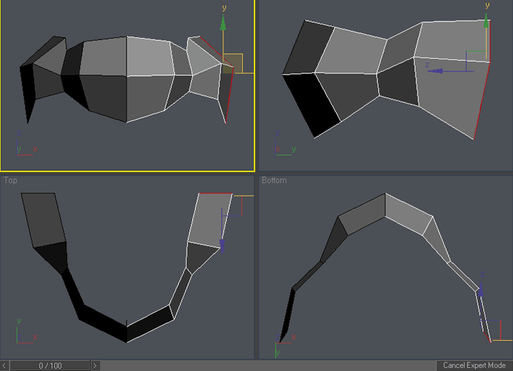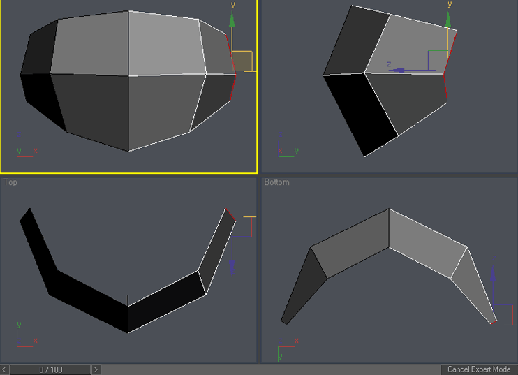 Ok , now the real fun begins. Select the right column of vertices and scale it down in Y axis in front viewport. To access scale command either right click on the object and choose “scale” o press “r” key. You can access other command similarly. Please try it: “q” for select, “w” for move, “e” for rotate and “r” for scale. You can add vertex to existing selection by holding Ctrl during selection or subtract vertex from selection by holding Alt during selection. Practice it a little so you are familiar with these shortcuts, now use Ctrl-z in case you have moved something you didn’t wanted 🙂