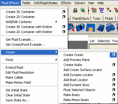 2-now go to (Fluid Effects) pull down menu then choose (Ocean>>Create Ocean) click on the option box describing on the picture below.