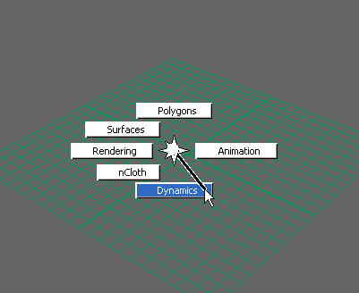1-fire up Maya if you are not in the (Dynamics) module hold down (H) key from your keyboard you will see pop up menus choose (Dynamics) like on the picture below.