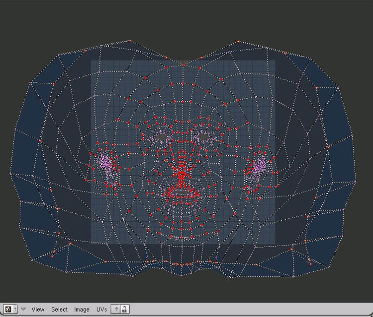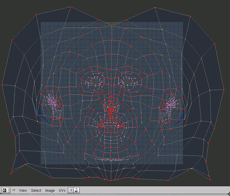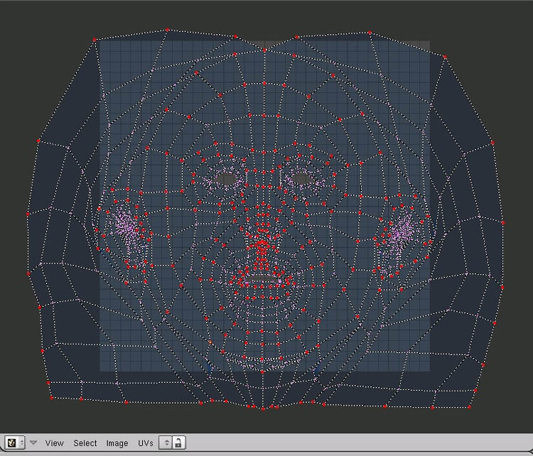It is, of course, much larger than the image grid (we’ll fix that shortly), and there are still a few spots where the faces overlap (indicated by the lighter purple shading when selected) which need to be fixed. The main problem with the preceding map is that the quads near the outside are much larger than they need to be.To fix this latter problem, select the vertices on the outside edge of the UV map (the brush select tool dragged over the vertices comes in handy here) and scale them inward.