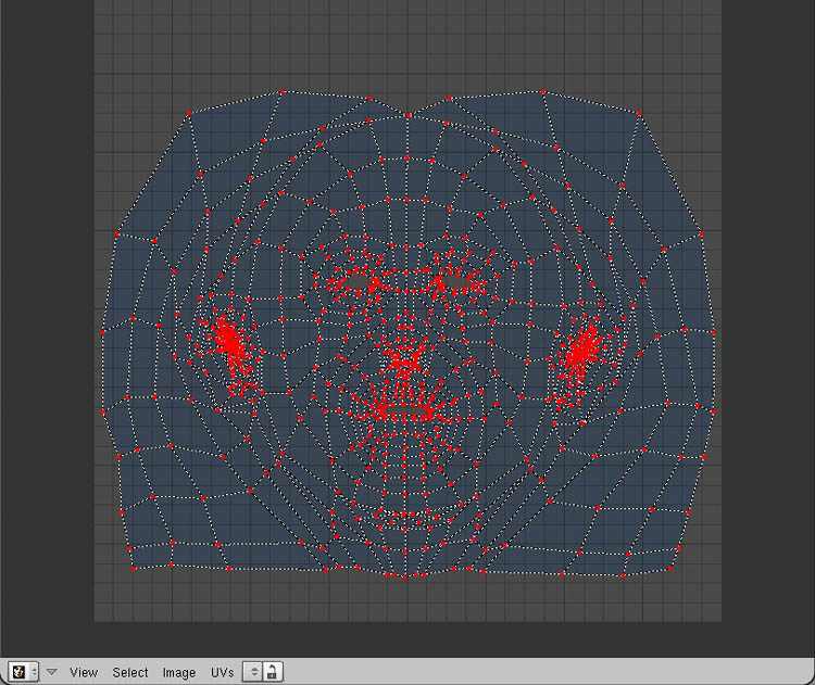 Not a big difference, but I like this outer edge better than the previous one. At this point, the UV map is fairly clean, the shapes are recognizable, and the part we are interested in painting (Adrianna’s Face) covers more image real estate than the part that will be covered by her hair. Select all the UV map vertices, and scale the map down to fit on the image grid. Pin all vertices. Now we can zoom in on the interesting parts and do some concentrated tweaking. Besides searching for and fixing any doubled faces (under the chin and near the ear) I generally tweak the eye, mouth and nose shapes to be a bit closer to the model, to make painting the map a bit more like portrait painting. I’ll generally adjust the shape of the eyes, the nostrils (especially the tiny cluster of vertices that occurs inside the nostril) and the corners of the mouth. I look for zig zag lines that in the model are straight, and I adjust edges flowing away from openings (eyes and mouth) to radiate from the center of the opening (more or less.)