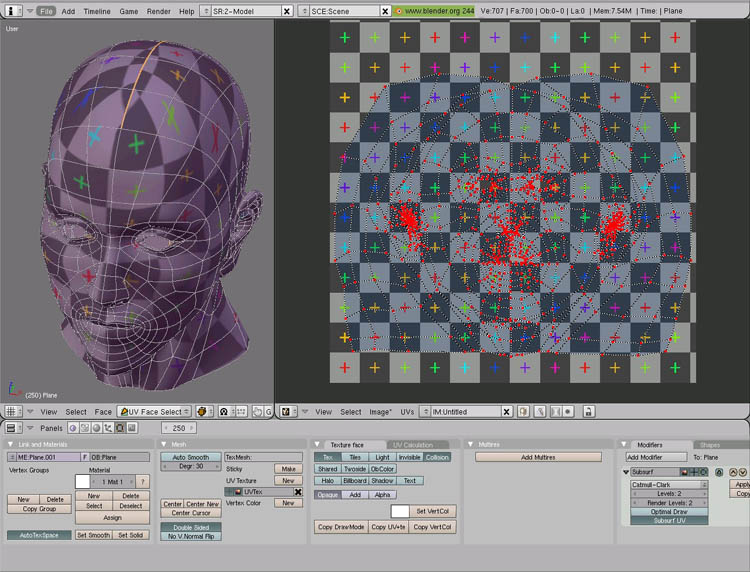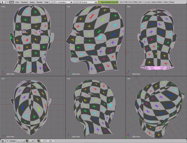 The UV map is now ready to be checked for stretching. There will be some stretched spots, there always are, but most of them will be in places that we aren’t really going to see in the finished model, unless she’s bald. We try not to get too stressed about those spots. To check for stretching, add a new image to the UV Image Editor grid, and press the UV Test Grid button in the new image panel. This adds an image to the list of available images, a checkerboard with colorful + signs on the squares, but does not necessarily attach this image to the model. In the 3D window, switch from UV Face Select Mode to Object Mode then back to UV Face Select Mode. Usually the image of the Test Grid will disappear from the UV image grid. Select all faces so the UV map shows up on the UV image grid. Then select the Test Grid image (possibly called “untitled,” the default name) from the list of available images. This time the image should reappear in the UV Image Editor window, and the model in the 3D window will be “painted” with the image.