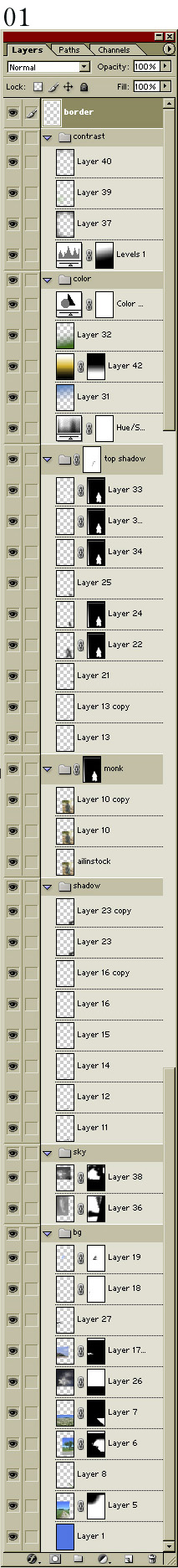 Picture 01 shows you my full layers palette – What I do here is go through the process from bottom to top for easier reference, however when working on a piece, nothing is quite as linear (though you do start with the basic pics of course).