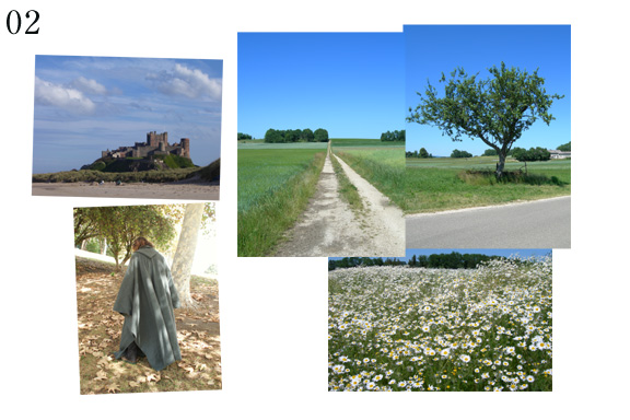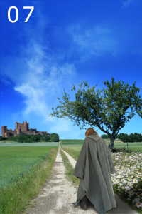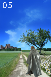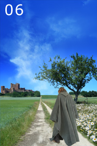 Picture 05: I put the pilgrim into the scene – he covers the part with the rough edge between the tree picture and the path picture 😉 – the problem is that he was shot underneath some trees and the shadows and lights on his coat need to be covered up.