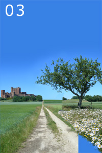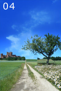 Picture 04 : I used a picture of clouds (desaturated via Channel Mixer, contrast enhanced via Levels) on “Soft Light” to get some clouds in. I used the Clone Brush Tool to patch some bits and pieces together (added the path where the picture was cut off, added some trees/bushes in front of the castle).