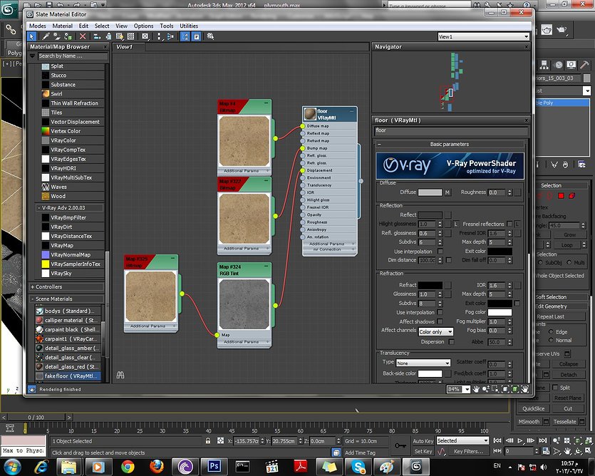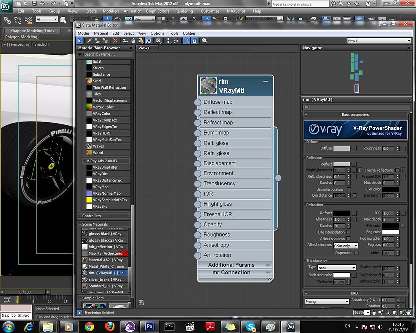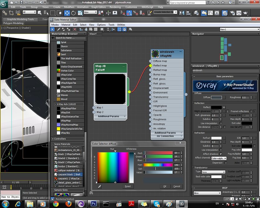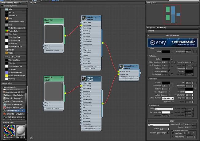 For the car paint I used a Shellac map, then in the base slot I used a VRayMtl shown in the image below.