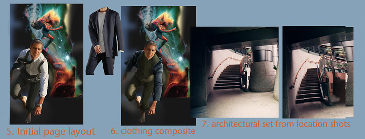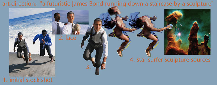 Photo/Digital Images Are composed by montaging 2 to 50 photos (usually small parts of photos) into single image, using Adobe Photoshop as the primary tool. I have about 80,000 royalty free stock images from Photodisc, Corbis, Metaphotos, the Department of Defense, Corel, and Nasa that I keep in a searchable Extensis Portfolio catalogue. There are also webpages specializing in royalty free photos for illustrators. For example:
