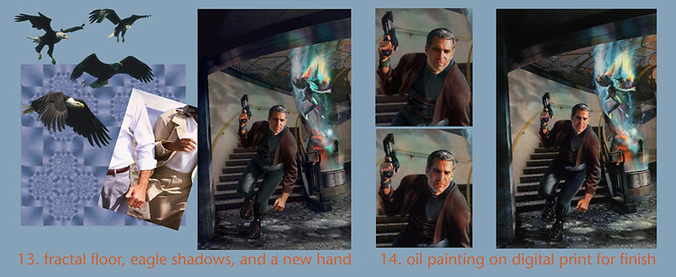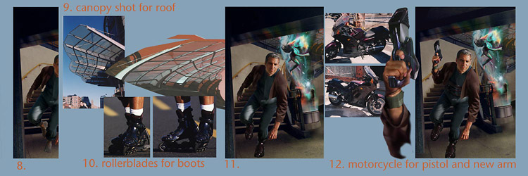 Another photo collage:I did use photos from www.3d.sk to go through the sketch process, and build the figures in this piece for a novel for Bantam. She has Ilona’s face, and left arm from the two Silvias. Also Anetta Key’s boots. He is build over Ivan, and bits of him survive here.
