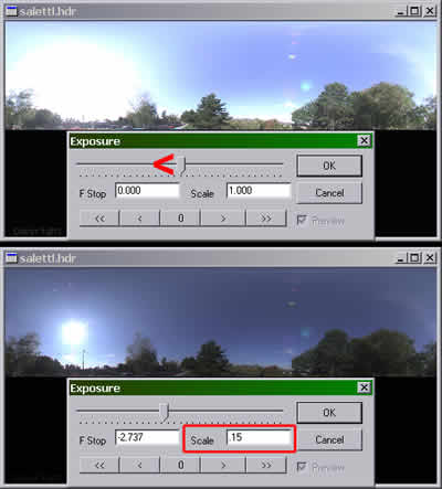 So, let’s go and measure lighting level of our HDRI image (see the next image). I will use one hdri image from www.cgtechniques.com named salettl.hdr. Start the HDRIShop. Import in HDRIShop your hdri image. As you can see, the big part of the image is white. These are the parts where light brightness goes above the 255 levels. To find out how much brighter these areas are you must go to the View > Exposure > Costum. The exposure menu will pop up, with slider bar in it. Move slowly this slider in the left direction to the point where sun starts to lose it’s white color and becomes gray. In the informations below the slider is the box where the Scale information is shown. This information is important since it shows how much we must multiply the white color in ldri image to get the brightness like in the hdri image. Now with your calculator divide number 1 with that value (mine is 0.15). The result should be somewhere around 6.6. Remember this value since this is the value with which we will multiply the parts of LDRI image where sun is.