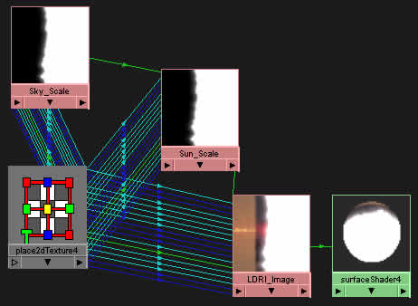 As you probably know, we must connect the place2DTexture node to the Sky_Scale node to get the correct mapping. So, with CTRL pressed, drag with middle mouse button the place2dTexture node and drop it to Sky_Scale node.