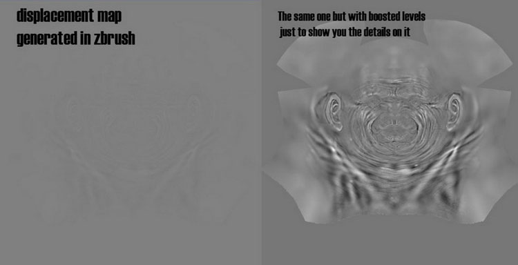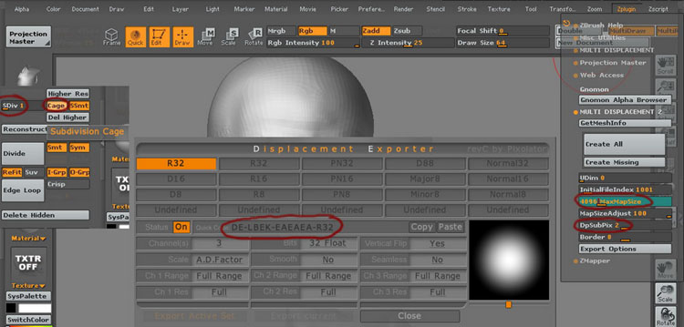 Now I want to export my models to 3dsmax. First I go to lower division (1 or 2) in Zbrush and I activate the CAGE button (the low res mesh tries to match with the highest division) Then to create my displacement map I use the MULTIDISPLACEMENT 2 pluggin with these options: