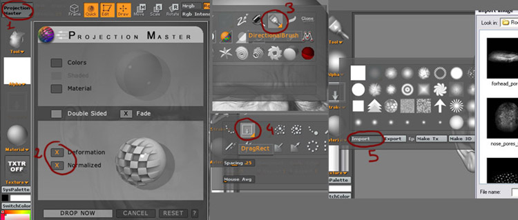 For the details I use the projection master with the directional brush and some brush I made form heads pictures. Don’t forget to remove MRGB and to activate ZADD or ZSUB.