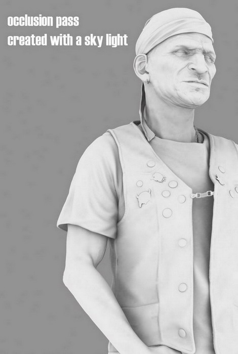 Before I go to Photoshop I need an occlusion render. There are different ways to do it and for this one I used only a sky light (intensity 1) and a white material on all my models. I will use this render in multiply mode in Photoshop to accentuate my shadows.