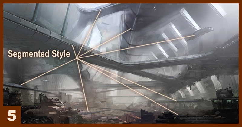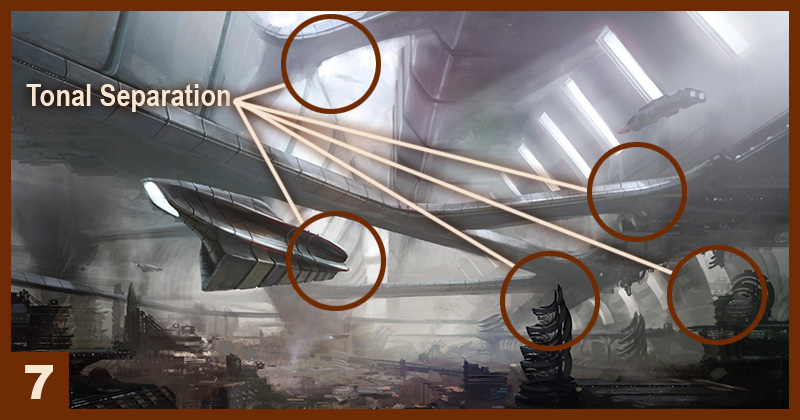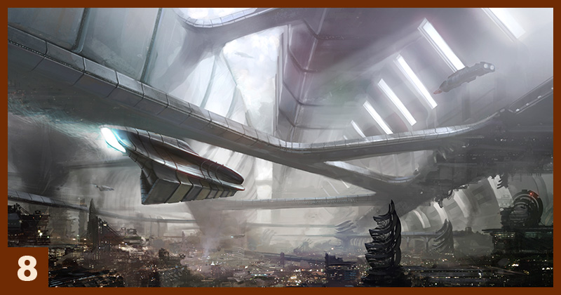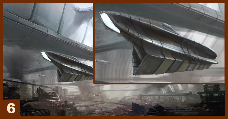 5. Ok, the spaceship in the foreground really sucked so it got kicked out. I am now concentrating on the background again and trying to make the architectural elements come together. It is important to use one form language for all objects in the scene to make things more believeable and realistic, otherwise it would look just too fantasy. Therefore i‘ve applied the segmented style of the huge main shapes to the air bridges here.
