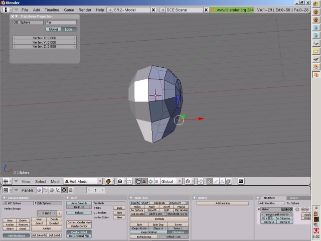 Start by loading the mesh into Blender. I created the startings of a head from a sphere for this example.Hitting “N” on the keyboard opens the Transform Properties box and allows for more precise editing.